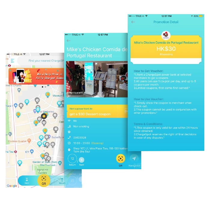 ผู้ใช้สามารถดาวน์โหลดแอพฯบนโทรศัพท์มือถือได้ฟรี โดยแอพฯจะแสดงสถานที่ตั้งของจุดบริการ CHARGESPOT และข้อมูลเกี่ยวกับสถานทีร้านค้า และพันธมิตรสามารถโปรโมทสินค้า ส่วนลด หรือบริการผ่านแอพฯ CHARGESPOT เพื่อดึงดูดผู้ใช้งานให้กลายเป็นลูกค้าของร้านเราได้